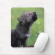 Photo d'un adorable petit loup noir hurlant dans l'herbe.