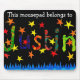 Une mousepad de bonne qualité avec un collage en papier peint à la main et coloré disant "Cette mousepad appartient à Justin" sur un arrière - plan noir. Voir aussi carte de voeux et cadeaux correspondants.
