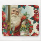 Vintage illustration of Santa Claus bringing toxicts and presents for Christmas, decorated with holly berries and poinsettias.
