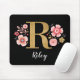Un magnifique tapis de souris rose monogrammé féminin, avec des fleurs roses et une lettre en or monographie R sur un arrière - plan noir. Personnalisez le pavé de souris en ajoutant votre nom sous le monogramme. Fait un cadeau amusant pour un ami ou pour un cadeau de femme d'honneur. Conçu pour vous par Blackberry Boulevard.