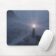 Un phare avec une croix tandis que la lumière rayonne sur les rochers et les briseurs d'un rivage couvert de brouillard, montrant les bateaux entrants le chemin de la sécurité.