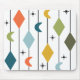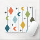 Ce pavé de souris a un design moderne du milieu du siècle de lignes verticales avec des diamants et des boomerangs, avec des éclats éparpillés dans l'arrière - plan.