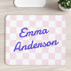 Mousepad avec votre nom en bleu une police de style rétro bleue sur un motif en damier rose pâle et blanc.