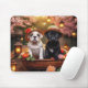 Mousepad aux adorables chiots assis dans un bateau au bord d'un lac entouré de beaux arbres fleuris