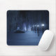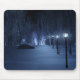 Un sentier enneigé serpentant à travers la forêt de bouleaux, lors d'une nuit d'hiver sombre. Le chemin est bordé de lampadaires qui dégagent une lueur bleu argenté, mais dans les ombres sont lumineuses, des formes fascinantes comme de petites lumières féeriques, attirant le voyageur hors du sentier. Au loin, la lueur de lavande d'un mystérieux rassemblement de forêt illumine le ciel froid.