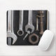 Plaque de souris avec photo des outils d'un mécanicien (écrous, écrous et boulons) sur une surface réfléchissante en fibre de carbone