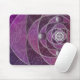 Un design en vitrail de spirales argentées et de tons de prune, sur un fond répétitif de fractales en spirale. Les spirales argentées convergent en un rose argenté, avec des pierres rondes pour accents.