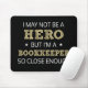 Je ne suis peut-être pas un héros, mais je suis un gardien de livres si proche de l'art du mot humoristique dans les caractères sans-serif et doodle cross-hatch en lettres blanches et jaunes dorés.
