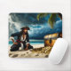 A pirate kneels beside a wooden chest and gold coins on a tropical beach, as a storm gathers.