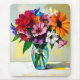 A pretty floral mousepad with an illustration of a colorful vibrant glass vase of flowers done in an ai impasto style oil painting.