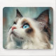 Un portrait en gros plan d'un chat Ragdoll aux yeux bleus saisissants. Le chat a un manteau blanc et moelleux et porte un collier noir avec un charme de pierres précieuses bleues. Les yeux du chat sont grands ouverts et concentrés sur quelque chose hors caméra, créant un sentiment de curiosité et d'émerveillement. L'arrière - plan est d'un bleu pastel doux avec de délicates fleurs roses disséminées dans l'ensemble, ajoutant une touche de fantaisie et d'élégance à l'image.