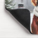 Un chien portant un casquette tricoté gris et une écharpe se dresse dans une forêt enneigée à côté d'un bonhomme de neige