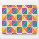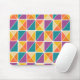 Ce tapis de souris a un design Bauhaus de carrés en triangles dans les tons orange, jaune, violet et bleu.