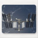 La Station Spatiale Internationale, sur fond de terre bleue et blanche.