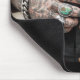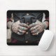 Homme avec les anneaux gothiques de crâne et le tapis de souris tatoué de mains.