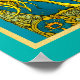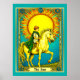 Poster in einer Abbildung der Tarot-Karte "Die Sonne", die eine strahlende Sonne darstellt, die den Himmel beherrscht, ihre goldenen Rochen, die einen Jungen umgeben, der auf einem weißen Pferd reitet. Er symbolisiert Unschuld und Vitalität, während der lebendige blaue Hintergrund Freude und Klarheit ausstrahlt.