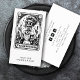 Eine Visitenkarte im Stil eines Tarots mit einem Skelett mit Werkzeugen des Stylisten. Ein einzigartiger Stil mit einer Touch Spaß.
