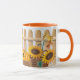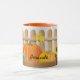 Farbenfrohe Kürbisse in einem Korb mit einem Holzzaun und farbenfrohen Sonnenschirmen. Eine schöne Tasse, um sich mit dem Namen Ihrer Wahl zu personalisieren, perfekt für den Erntedank.