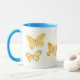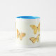 Eine weiße Tasse mit blauem Rand und Griff und einem zarten, bemalten Design aus orangefarbenen Schmetterlingen.