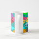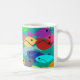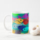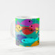 Diese Tasse hat ein Design einer Fischschule in Grün, Blau, Orange, Gelb, Rot, Rosa und Blau-Grün im Ozean.