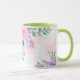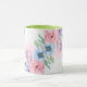 Diese hübsche Tasse zeigt hübsche Blume in Rosa, Lavendel, Blau und Grün und Akzente rund um die Tasse auf weißem Hintergrund. Das Innere und der Griff der Probe werden mit auffallendem Kalkgrün dargestellt. Wechseln Sie auf Wunsch in den gewünschten Griff/die gewünschte Innenfarbe. Passen Sie diese Tasse an oder kaufen Sie sie wie geplant.