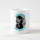 Das Bild zeichnet sich durch ein schlichtes, aber auffälliges Design einer Kaffee-Tasse auf schwarzem Hintergrund aus. Die Tasse hat Dampf, der von ihr aufsteigt, was darauf hindeutet, dass sie mit heißem Kaffee gefüllt ist. Auf der Tasse gibt es eine grafische Abbildung einer Person, die eine Tasse hält, eine Brille trägt und einen Bogen im Haar trägt. Oben und unterhalb dieser Abbildung ist der Text "COFFEE ADDICT" in hellblau geschrieben, der die zentrale Grafik umgibt. Das Design ist sauber, modern und spielerisch ästhetisch.