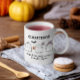 Cute, moderne Halloween Mug avec des fantômes amicaux avec une chauve-souris et araignée d'un côté. L'autre côté a un graphique différent d'une araignée mignonne à côté d'une boisson d'épices citrouille. Texte modifiable des deux côtés.