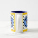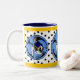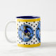 Mug de vacances joyeux avec la variante originale de Jewbilee d'un elf Maxfield Parrish d'avant la Première Guerre Mondiale avec leggings à pois blanc et noir+une menorah sur sa chaussure+saluant "Happy Hanoukka" sur médaillon periwinkle, pois arrière - plan & bordures jaune ensoleillé.