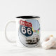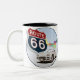 Route 66 Schild mit weißen 1961 Chevrolet Corvette, und Linie mit den Staaten zu zeigen, wo die Straße läuft. Diese ikonische Straße führt von Chicago, Illinois nach Santa Monica, Kalifornien. Obwohl die Route 66 selbst technisch nicht mehr existiert, sind bis heute etwa 85% davon noch zu befahren!