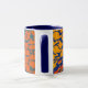 Tasse blanche avec jante et poignée bleu foncé, décorée de poissons orange sérigraphiés sur un arrière - plan bleu foncé