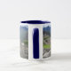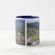 tasse blanche avec le picchu de machu là-dessus avec la jante et la poignée bleues