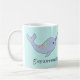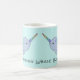Chaque côté a un narwhal mignon avec un klaxon et des taches d'arc-en-ciel. "Tout baleine soit ok" est enroulé autour de la tasse.
