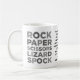 Tasse de papier de Spock de lézard de ciseaux de roche avec des RÈGLES : Les ciseaux coupent le papier, le papier couvre la roche, la roche écrase le lézard, le lézard empoisonne Spock, Spock heurte des ciseaux, les ciseaux décapitent le lézard, le lézard mange le papier, le papier réfute Spock, Spock vaporise la roche, et comme elle a toujours, la roche écrase des ciseaux.