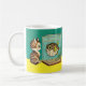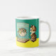 Une tasse avec un chat et un poisson-pouffer se regardant dans la surprise