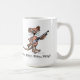 C'est une tasse avec une image de bande dessinée d'une souris tenant un fusil de chasse. La légende lit, "ici minou, minou, minou !"