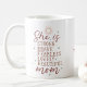 Dieses einfache Design enthält den Satz: "Sie ist stark, tapfer, furchtlos, hübsch, schön, Mama." mit niedlichen Stern- und Sonnenakzenten. Diese Kaffee-Tasse kann mit einem Namen oder Initialen personalisiert werden. Ein tolles Geschenk für diese besondere Frau in Ihrem Leben für jeden Anlass!