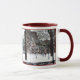 Ein wunderschöner Weihnachtsbaum schmückt während eines Schneefalls auf dieser festlichen Tasse ein Feld.