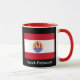 Le drapeau de la Polynésie française a été adopté en 1984. Deux bandes horizontales rouges emballent une bande blanche large dans un 1:2 : 1 rapport ; porté sur la bande blanche est un disque avec un motif de vague bleu et blanc dépeignant la mer sur la moitié inférieure et un motif d'or et blanc de rayon dépeignant le soleil sur la moitié supérieure ; un canoë polynésien monte sur le motif de vague ; le canoë a un équipage de cinq représentés par cinq étoiles qui symbolisent les cinq groupes d'île ; le rouge et le blanc sont des couleurs polynésiennes traditionnelles.