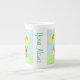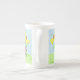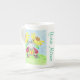 Une jolie tasse personnalisable Bone China avec une coccinelle lisant un livre sous deux fleurs jaunes. © ArianeC Illustrations