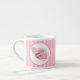 Tasse expresso en céramique blanche avec l'image, de part et d'autre, d'une abeille au miel blanc rose, violet et jaune dans un cercle blanc avec une bordure rose sur des rayures rose-sur-rose. Voir la bocale à bonbons, le lanceur, la plaque en papier, la théière et les dessous de verre correspondants. Voir l'ensemble de la collection Kids' Corner Mug dans le FOOD/BEV | Section Plats.