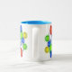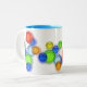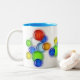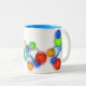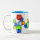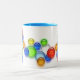 Drei Gruppen von 3D-Bläschen (rot, grün, orange, klar, blau), die von unten in der Tasse aufsteigen. Siehe koordinierte Teekanne hier: