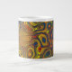 Un café Jumbo cool ou Soup Mug, avec un motif abstrait de tourbillons fou dans les tons foncés, bleus, vert foncé et marron avec des reflets jaunes dorés.