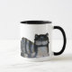 Katze, schwarz und weiß gestreift. Die Malerei der Katze wird mit Schwanz geklebt und Hitze Alarm gestellt. Lange Haare zeigen in fließendem Schwanz und Gesicht. Ein Bild auf jeder Seite, gegenüber dem Griff der Tasse.