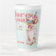 Tasse en latte personnalisée avec "love you a latte". Design mignon avec motif à pois rétro et illustration d'une tasse en latte chargée de fraises et crème, macarons, beignets et douceurs.