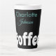 Élégante tasse en latte avec "Café" et le nom "Charlotte Johnson" en typographie turquoise sur un arrière - plan noir. Vous pouvez simplement le personnaliser en ajoutant votre nom. Café, pas votre boisson ? Modifiez-le facilement à l'aide de la zone de texte personnalisée. Si vous souhaitez modifier la couleur ou la police, consultez l'outil d'édition de conception pour plus d'options ! Profitez de votre café en style ! Il fait également une excellente idée cadeau pour les amateurs de café! Si vous avez besoin d'aide pour la personnalisation, la mise en correspondance de produits ou pour un design personnalisé, contactez-moi par zazzle conversation ou email : ursuladawnmoon@gmail.com