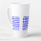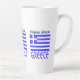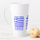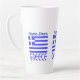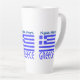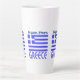 Une grande tasse en latte montre le drapeau grec et le mot GRÈCE, en dessous, en bleu. Le drapeau présente des rayures bleues et blanches avec une croix bleue et blanche en haut à droite. Au-dessus, ajoutez un nom pour une touche personnalisée ou créez un cadeau customisé. Le design se déroule sur trois côtés de la tasse. Amusez-vous pour des réunions de famille, des groupes de voyage et partagez votre amour et votre fierté pour votre patrimoine, votre ascendance et votre culture. Idéal pour célébrer la Journée d'Oxi (Ohi ou Ochi, aussi).