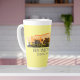 La tasse en latte élégante présente la plage de Huntington, la silhouette de la ville de CA avec les coordonnées de latitude et de longitude et un lavage à l'eau orange du coucher du soleil sur l'arrière - plan jaune.
