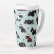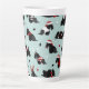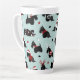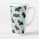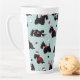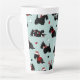 Chiens écossais mignons habillés de tenues de vacances festives, chapeaux de Père Noël et chandails de Jacquard avec des ornements de Noël éparpillés sur un arrière - plan bleu.