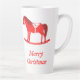 Cette magnifique tasse en latte de Noël présente une image art numérique d'un mignon cheval à bascule de style scandinave. Le cheval est rouge avec une crinière rouge foncé, la queue et les sabots. Le cheval sympathique sourit. Il a une selle blanche et des rois avec de jolis motifs de style Scandi rouge sur la selle, y compris le soleil, la lune et les étoiles, les coeurs et les fleurs. La base du cheval rocking est rouge et est couverte de feuilles blancs. Le design a été inspiré par le cheval suédois Dala. Il y a du texte personnalisé pour que vous puissiez personnaliser ce design avec votre propre message.