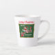 Cette tasse Latte a Santa Claus à bord d'un train rouge et blanc avec des roues à bonbons de menthe poivrée transportent des lettres et des sucres de canne sur un arrière - plan vert avec le texte : Choo, Choo Voici Comes Père Noël avec une bordure en or. Customisez le texte Joyeux Noël en haut avec le modèle.
